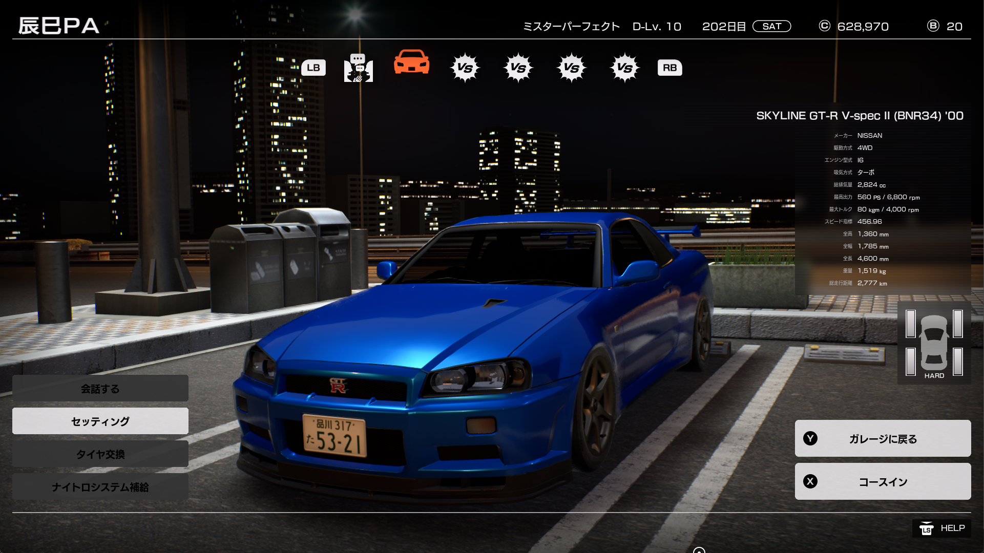 序盤お世話になったSUBARU BRZ、中盤最強のMAZDA RX-8、最後まで使えるNISSAN R34 GT-Rのフルチューン後の姿です。いずれもナイトロは外しています。
