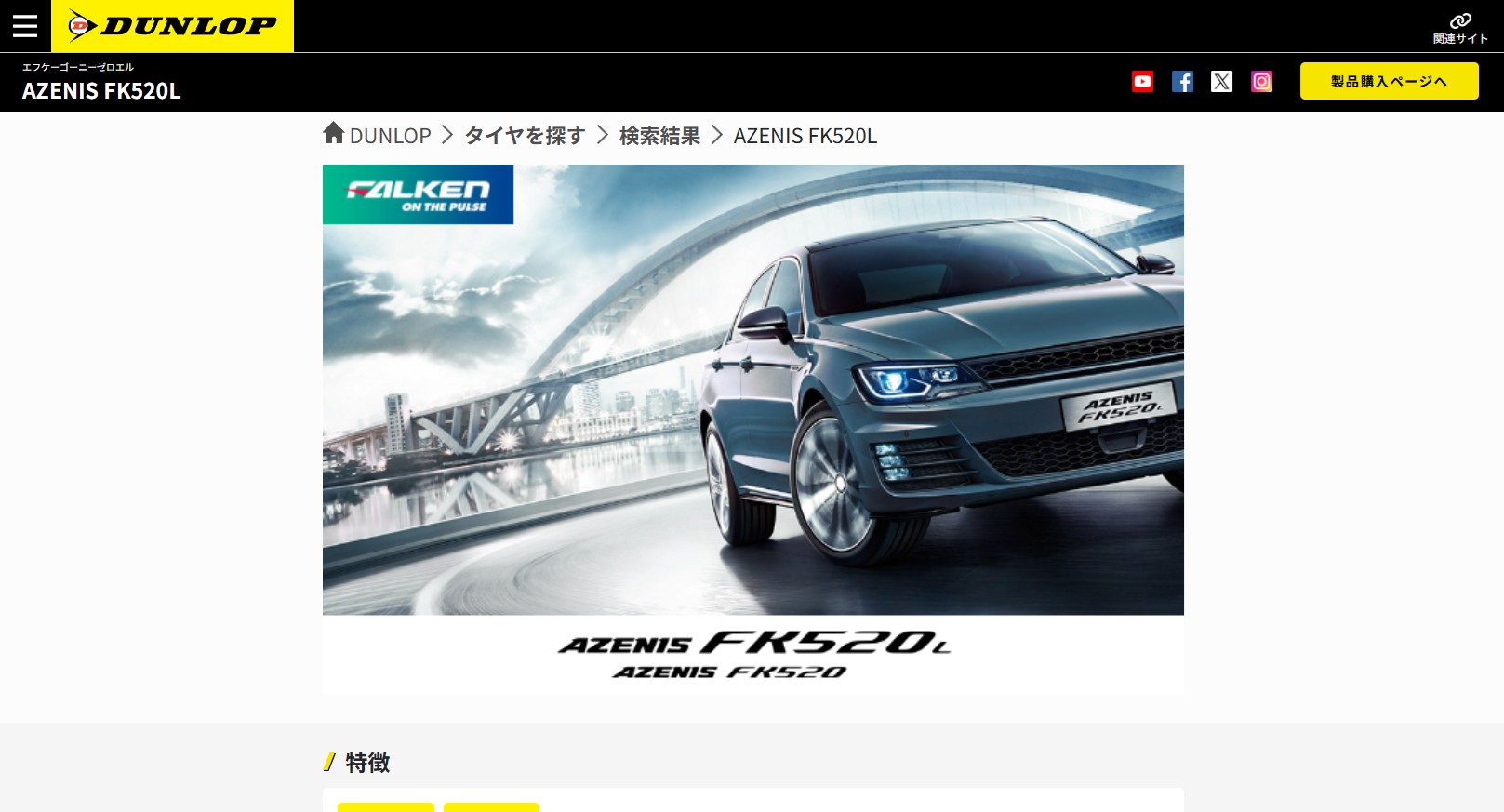 住友ゴム工業は日本でDUNLOP、FALKENの両ブランドを展開しています。DUNLOPのほうが名の通りが良いから?なのか、自社ブランドのFALKENブランドはやや雑な扱いを受けているようです。例えば両ブランドの同クラスの製品であるDUNLOP SPORT MAXX RSとAZENIS FK520Lのサイトを見比べると扱いの差がわかると思います。