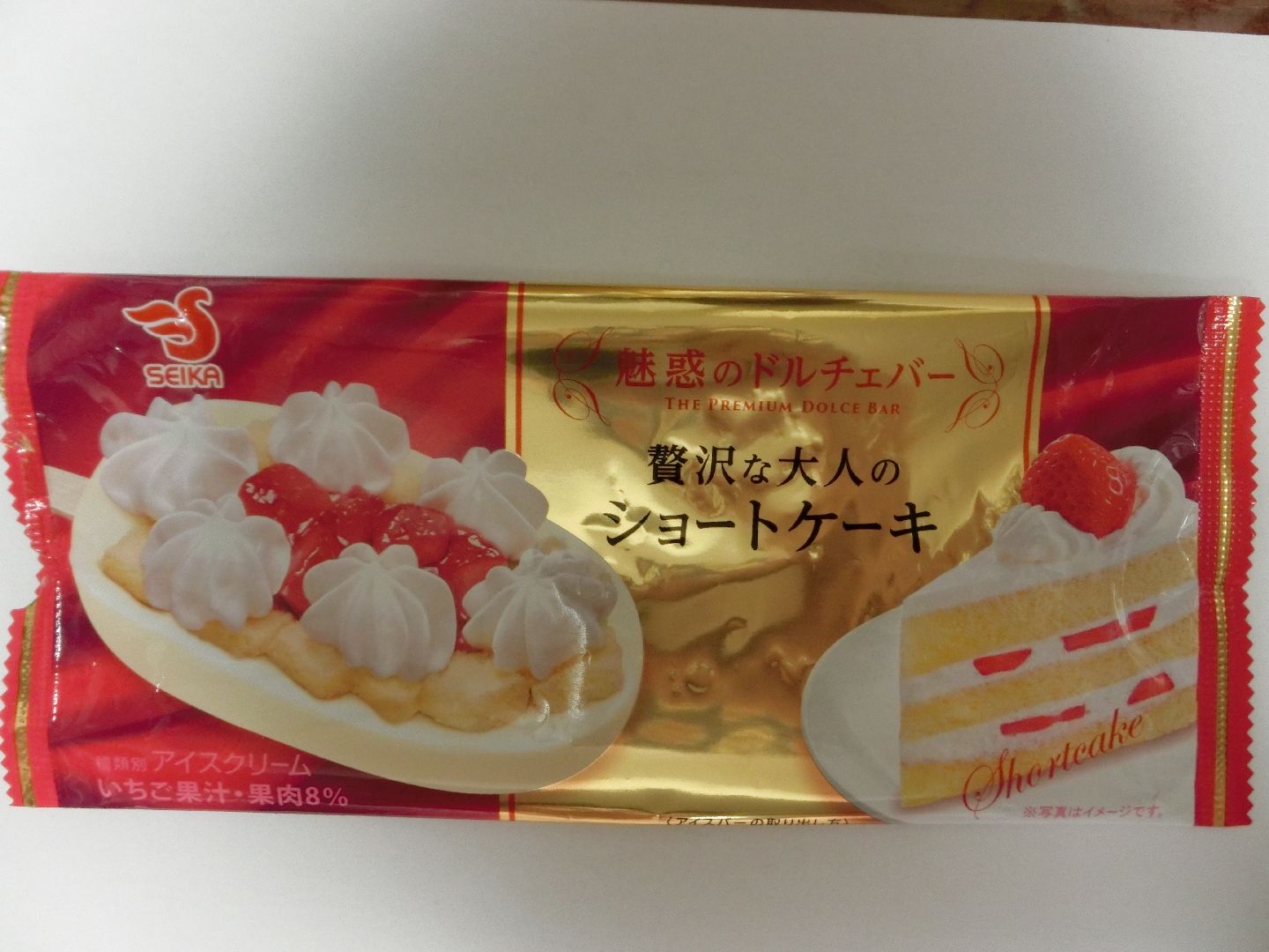 アイスの上にケーキ(スポンジ、生クリーム、苺)が載っています。アイスの上に載せているのにスポンジがフワフワなのが不思議です。
