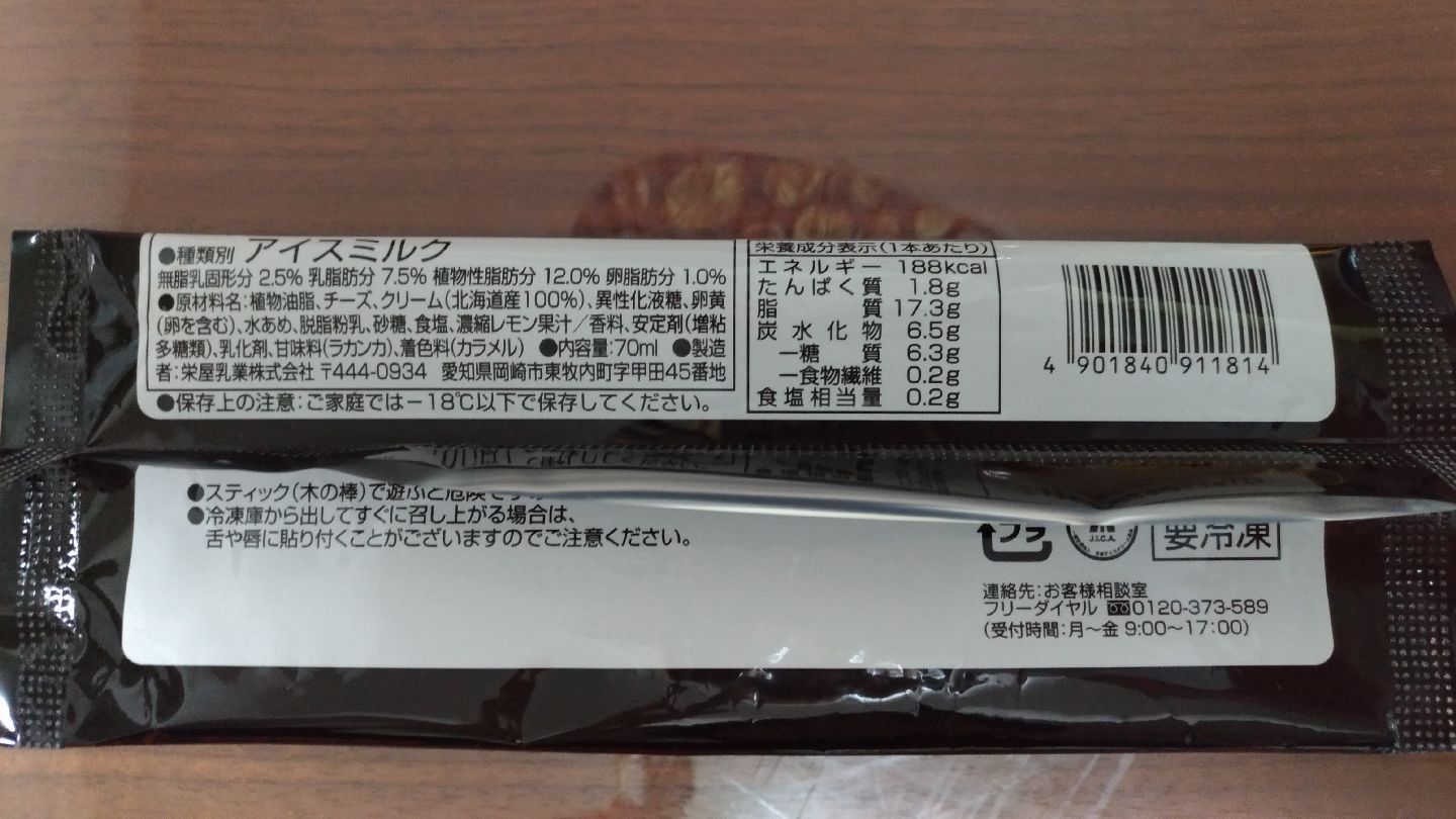 糖質 6.3g/本だそうです、ちなみに普通のアイスの糖質は 15~25g/本くらい。 じゃあ味が薄くてまずいんだろ?って思ったら大間違いです。制限されているのは糖質だけで、 脂質はアイスクリームクラス(16g/本)です。味は深みというかコクがあってとてもおいしいです。