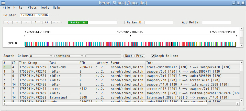 $ sudo trace-cmd start -e sched_switch $ sudo trace-cmd extract $ bin/kernelshark ./trace.dat