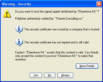 上記の 2 つのプロパティーが許可し、コードが適切に検証された証明書チェーンを使用して署名されている場合、コードに信頼を与えるかどうかを尋ねるセキュリティーダイアログボックスが表示されます。