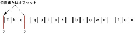 たとえば、前の図のようにドキュメントのコンテンツが「The quick brown fox」というシーケンスの場合、「The」の前の場所は 0 で、「The」の後とそれに続く空白の間の場所は 3 となります。「The」というシーケンスの全文字シーケンスを範囲と呼びます。