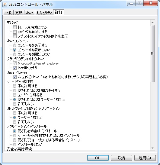 このパネルには、「デバッグ」、「Java コンソール」、「ブラウザのデフォルトの Java」、「Java Plug-in」、「ショートカットの作成」、「JNLP ファイル/MIME のアソシエーション」、「アプリケーションのインストール」、「安全な実行環境」、「混合コードセキュリティ検証する」、「証明書失効チェックを実行」、「高度なセキュリティ設定」、および「その他」のオプションがあります。