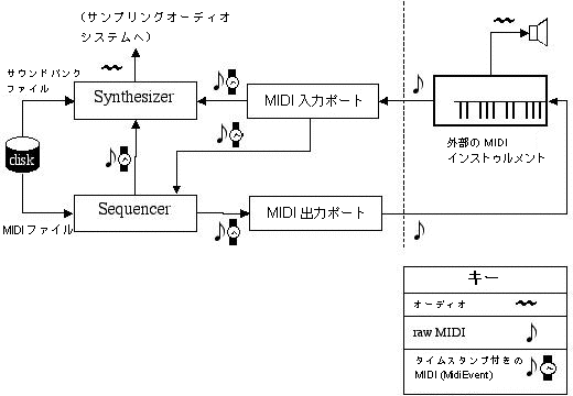 下の図に、Java Sound API を基にした、MIDI 構成例の中の主なコンポーネント間の機能の関係を示します。オーディオの場合と同様に、Java Sound API ではさまざまな MIDI ソフトウェアデバイスをインストールして相互接続することができます。ここで示すシステムは、一例に過ぎません。コンポーネント間のデータの流れは、矢印で示してあります。データは、標準ファイル形式のデータの場合もあり、オーディオ、raw MIDI バイト、時間のタグが付いた MIDI メッセージなどの場合もあります (図の右下隅の key を参照)。