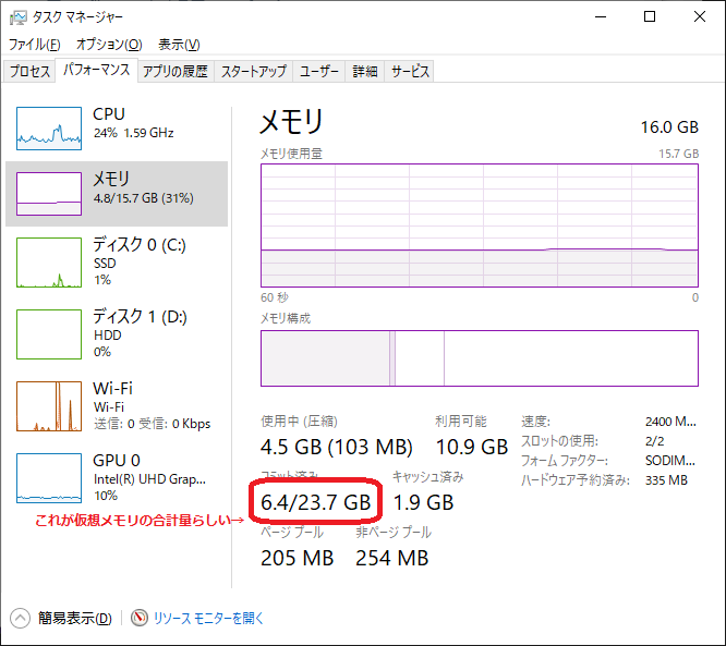 しかしタスクマネージャーの「詳細」タブに表示される、各プロセスのコミットサイズ(=仮想メモリサイズのことらしい)を足しても全く足りません。どういうこと??
