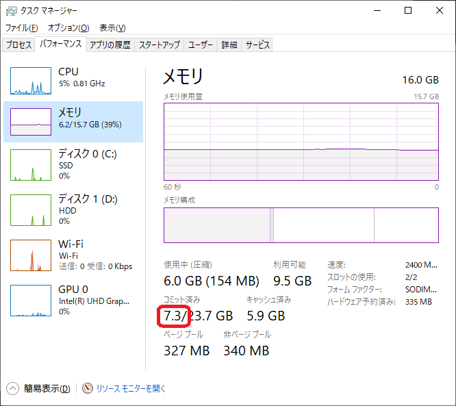 タスクマネージャーで「コミット済み」の値をチェックすると、仮想メモリの使用量がわかります。これがゲーム+ブラウザで17GBを超えていました。