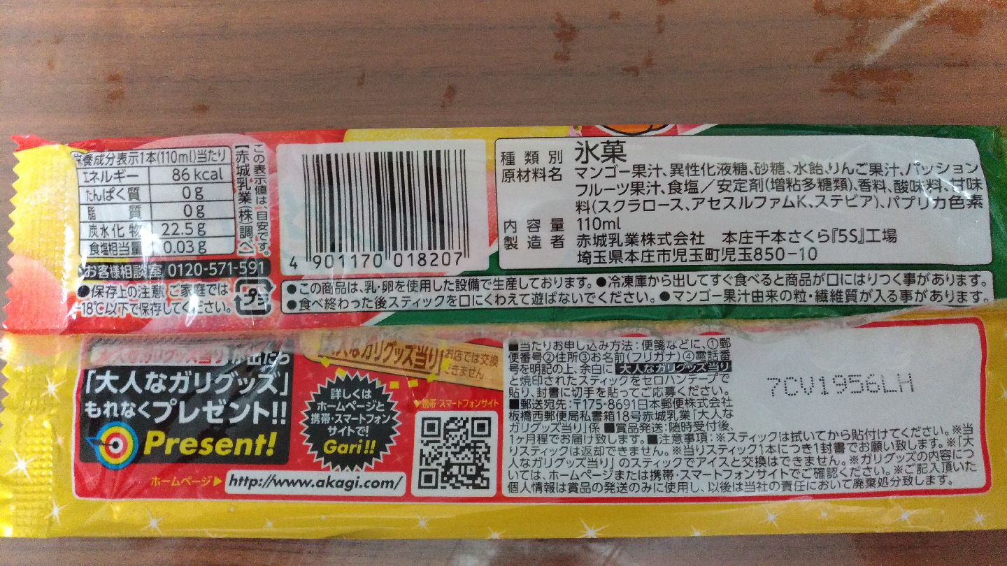 「ガツン、とみかん」の親戚。このシリーズは、みかん、もも、マンゴー、パインなど幾つか出ましたが、いずれも凍った果物そのものと、アイス部分のバランスがとても良いです。 赤城乳業は一番好きなメーカーだなー。
