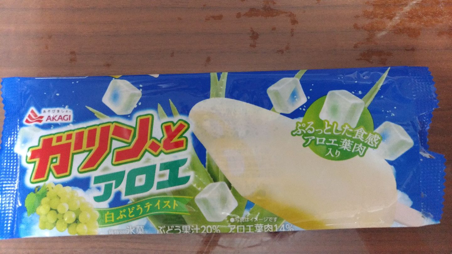 ブドウ味で、アイスもアロエも歯応えが柔らかくて、おいしいです。溶けやすいのか、冷凍庫から出してすぐでも表面が溶けたり、全体的にフニャフニャしています。歩きながら食べると落とすかも…?