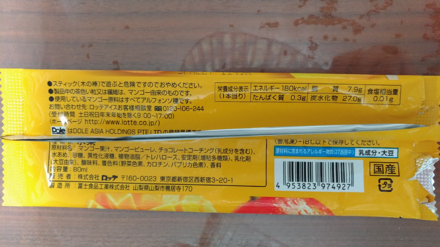 内側のアイスはマンゴーが濃いけど、しつこくなくおいしいです。 外側のチョコレートはあまり好きじゃなかった。中身と合わないのかな…。