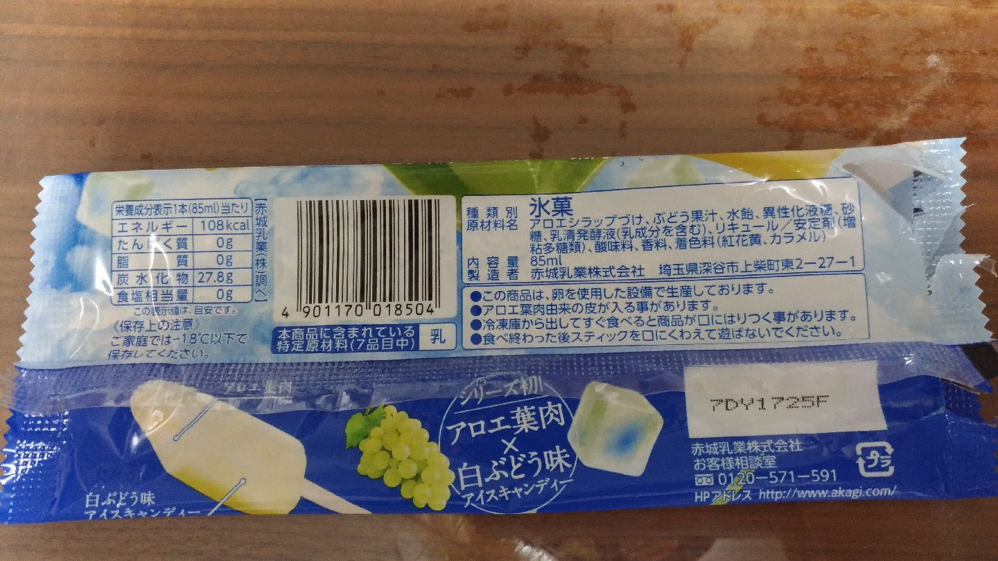 ブドウ味で、アイスもアロエも歯応えが柔らかくて、おいしいです。溶けやすいのか、冷凍庫から出してすぐでも表面が溶けたり、全体的にフニャフニャしています。歩きながら食べると落とすかも…?